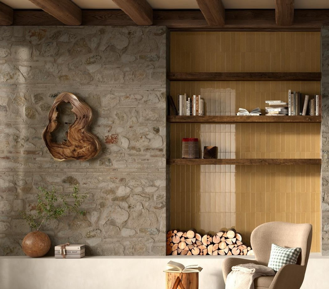 Mid reinterprets the revival of modern mid-century interiors, capturing vintage craftsmanship through innovative details. Each piece is unique thanks to glass grit and a glossy glaze, rich in nuanced tones and edge burnishing. The collection celebrates simplicity and sophistication, making it ideal for feature walls, as well as furniture elements and facades. With its harmonious colour palette and retro-modern character, Mid brings warmth and authenticity to contemporary spaces.