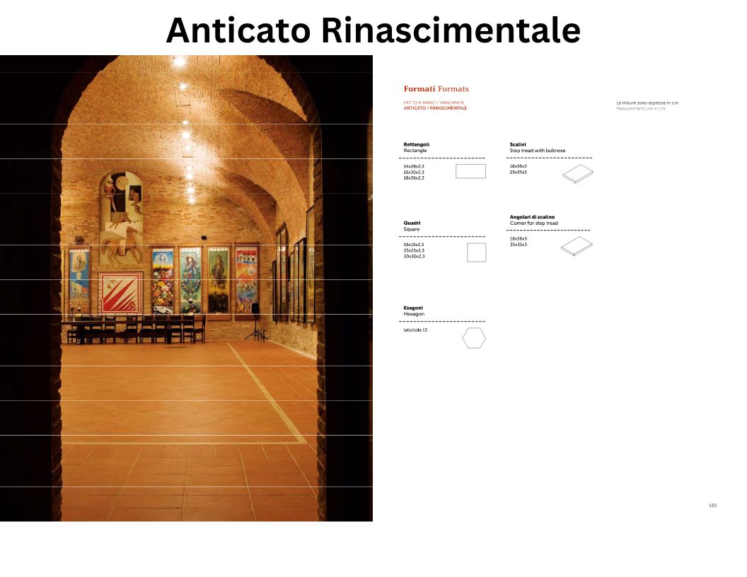 This “Anticato finish” is obtained with the traditional method of manual brushing before firing. Upon request a shaded version (Rinascimentale) is availble. Preferred use: interior.