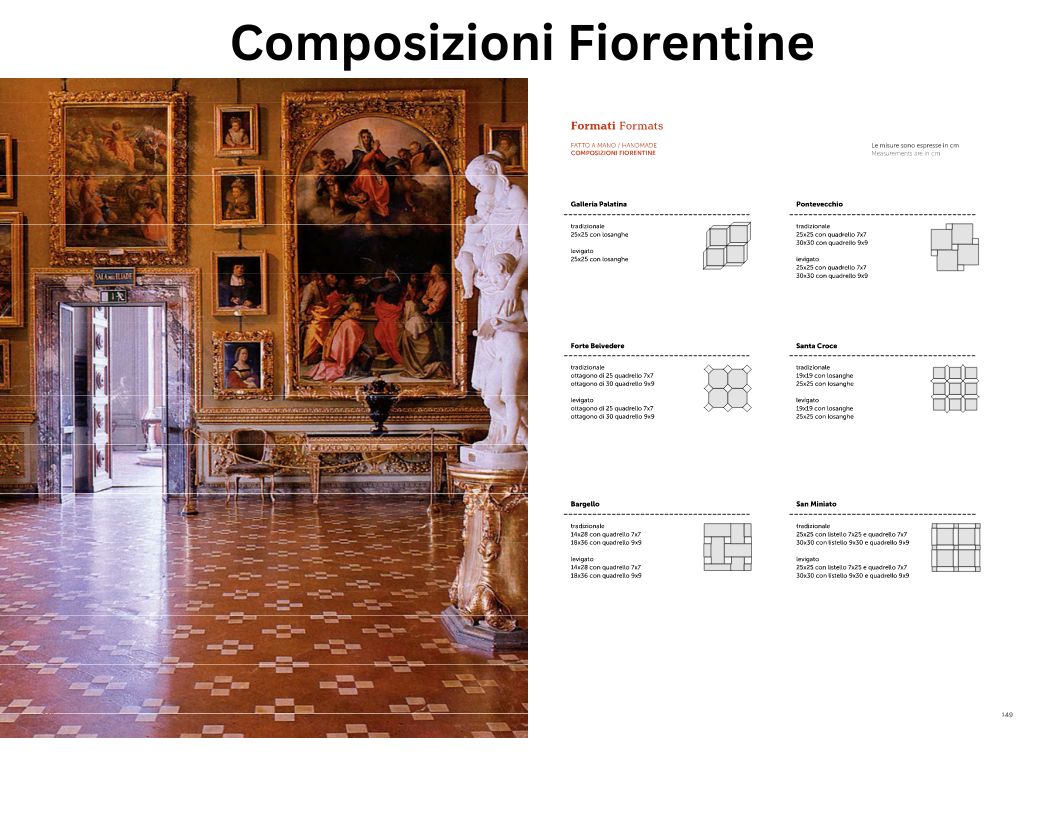 The experience acquired by eight generations of our family in producing Cotto, together with the master workmanship of “Turchina” and “Giglia” clay typical of our quarry, enabled us to rediscover a limited series of brickwork used to embellish 17-18th century Florentine palaces. These six different, strictly hand-crafted combinations, which are particular on account of the colour contrast between the two types of clay, help to enhance the elegance and uniqueness of brickwork floors.